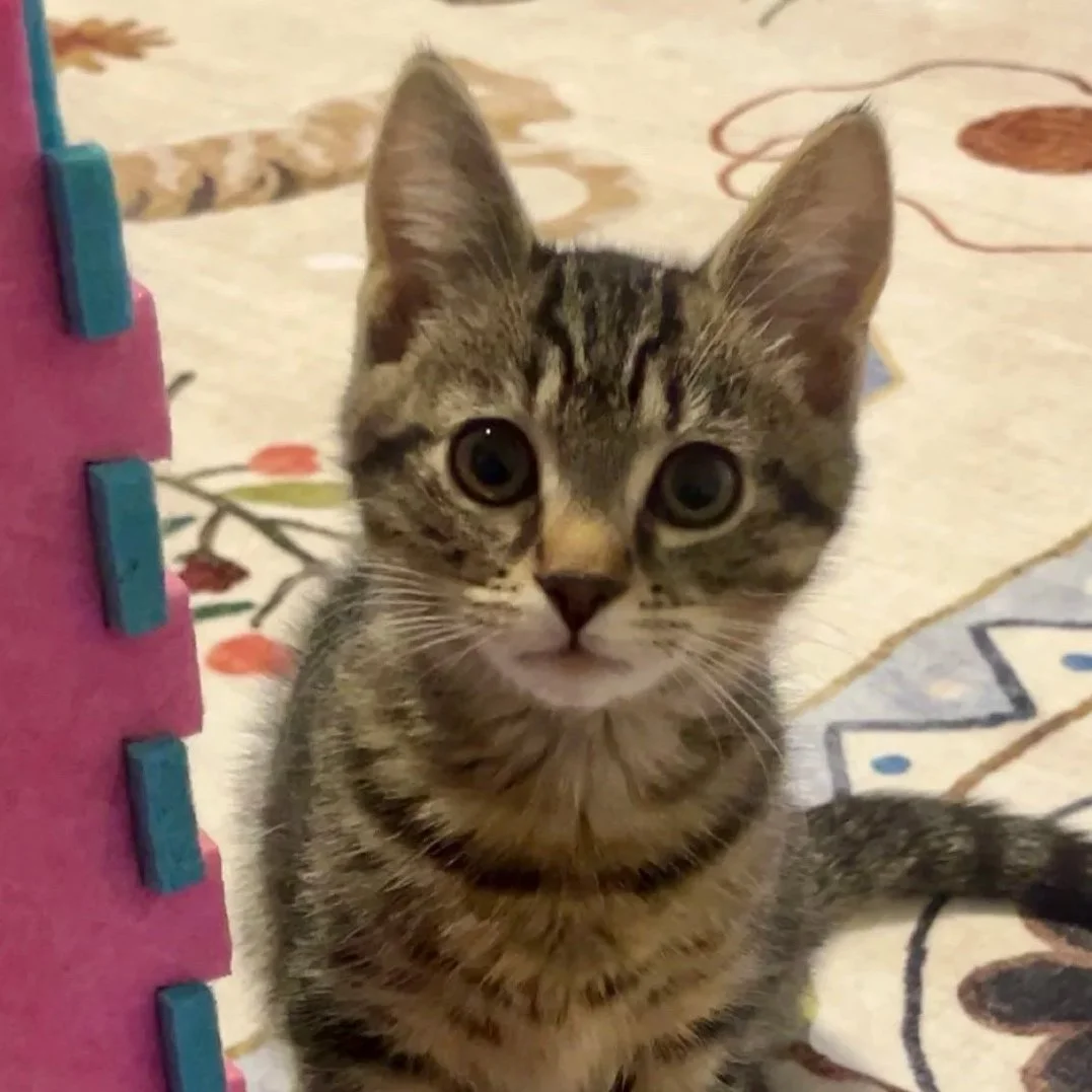 Hi! I’m Church! I am a 4-month-old, male, tabby kitten. I am a ball of energy! I love running around and playing with any and all kinds of toys. I love jumping on and playing with my siblings – even when it annoys them. I love to be petted and brushed. I love laps, but not as much as I love climbing on your shoulders and rubbing my face all over your face! I love giving kisses, too. I love food and treats of all kinds. I am good with other cats/kittens. I haven’t been introduced to dogs or to small children yet.