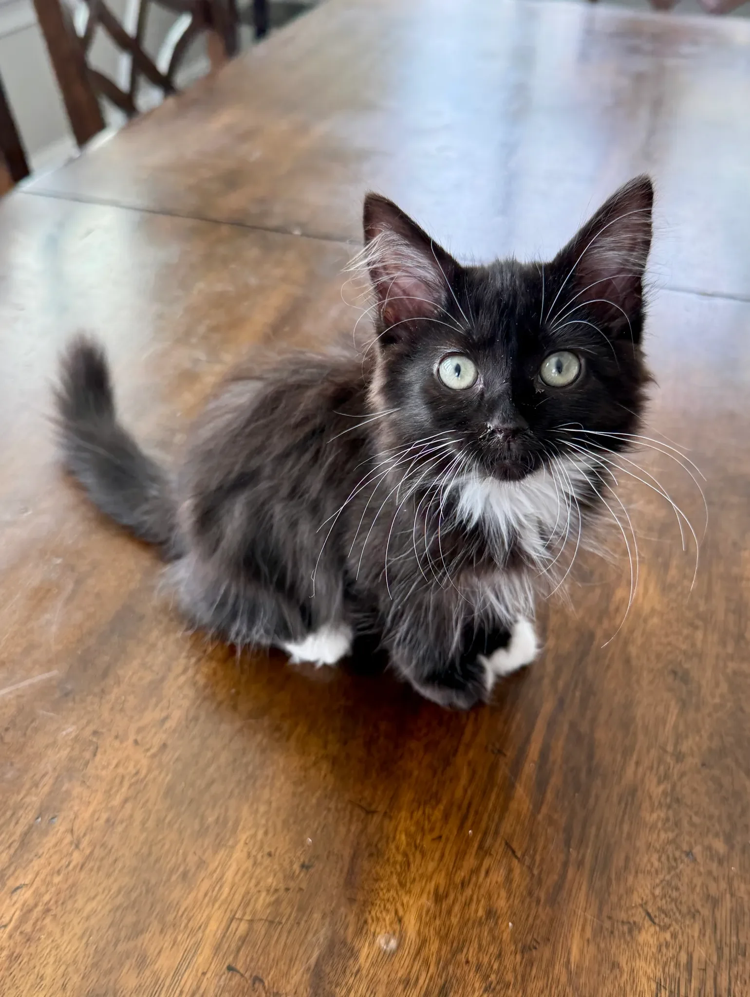 Hi! My name is Creamy Italian. I am a 3-month-old, medium-haired, male, Tuxedo kitten. I have a furry white chest and toes. My longer fur hides how tiny I am underneath, and it makes picking me up feel so good! My siblings and I were named after salad dressings, and we each have our own special flavor! I am a very reserved kitten. While I do enjoy playing, my best skill is observation. I will usually shy away from a toy if another cat is using it, but I love to have my turn, too. I am confident around adults but shy with loud children. Certainly kids do love me, but I need them to be calm and gentle. I purr at the drop of a hat, and adore anyone who will brush my fur gently or give me cuddles. I eat slowly so if you have another animal, I need my own space during meal time in order to not be left out of my share. I love lounging in cat trees and couches. I’ll be best in a house with adults, older children (age 8+), and other cats. I will not be ok with a dog. Will you let me purr my way into your heart? My adoption fee is $200.