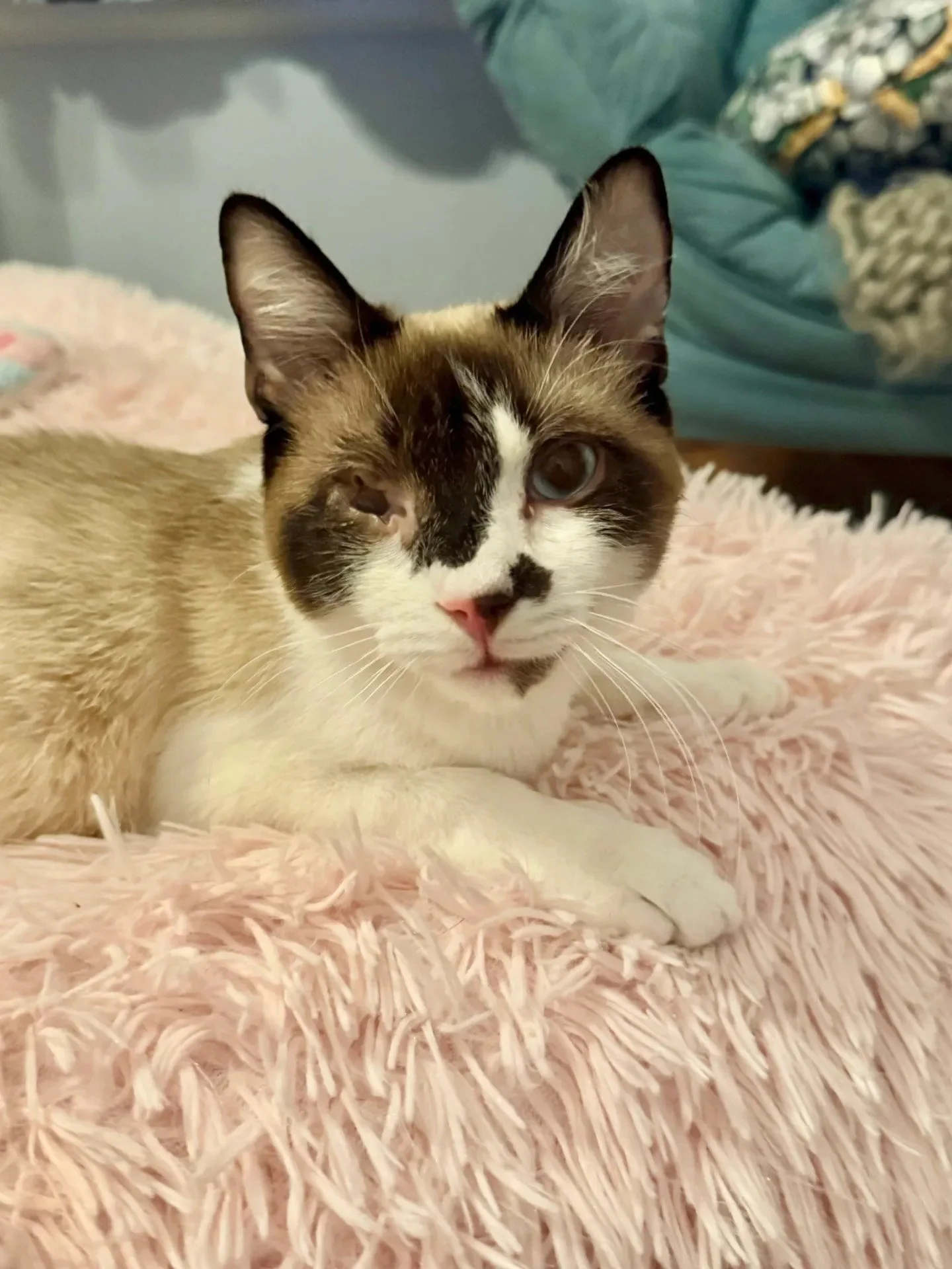 Hi, my name is Nordic. I am a 7-month-old, male, Siamese mix kitten. Hello humans – prepare to be loved! I am a regal boy with one weak eye. My eyelid was fused shut from birth. So, I have had three surgeries to repair it. While my bad eye doesn’t look great, I can see, and it should only continue to improve. Are you looking for a playful kitten that gets along with other cats and likes to be held like a baby? Look no further – I am your kitten! I only have one requirement for you – you must give me neck kisses on a regular basis. I enjoy playing with well-behaved young children, but I have not met a dog yet. Because I am easy going, I might be okay with one after an appropriate introduction period.