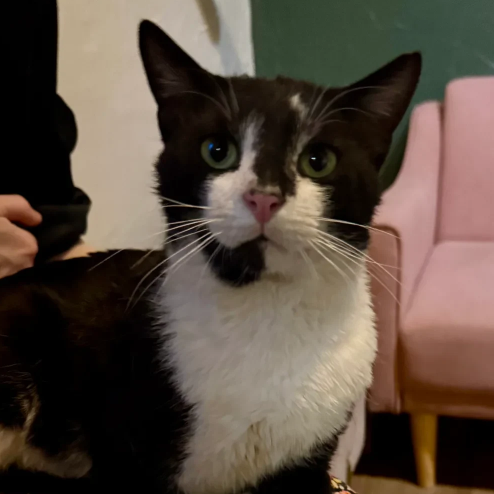Hi, my name is Harris. I’m a 1-year-old, male, black and white kitty. I know what you’re thinking – I should have been named “The One You’ve Been Looking For.” I won’t fault my foster for it, but I can prove it to you when you come check me out at the Purrfect Bean! I have the sweetest energy, a lot of confidence, and a loving personality. I couldn’t hold my excitement in when I got to have my very own toy! I was saved from a TNR organization, then Purring Hearts took me in. I do well with other cats. I haven’t been tested with kids or dogs yet. I can’t wait to show you all my friends and toys!