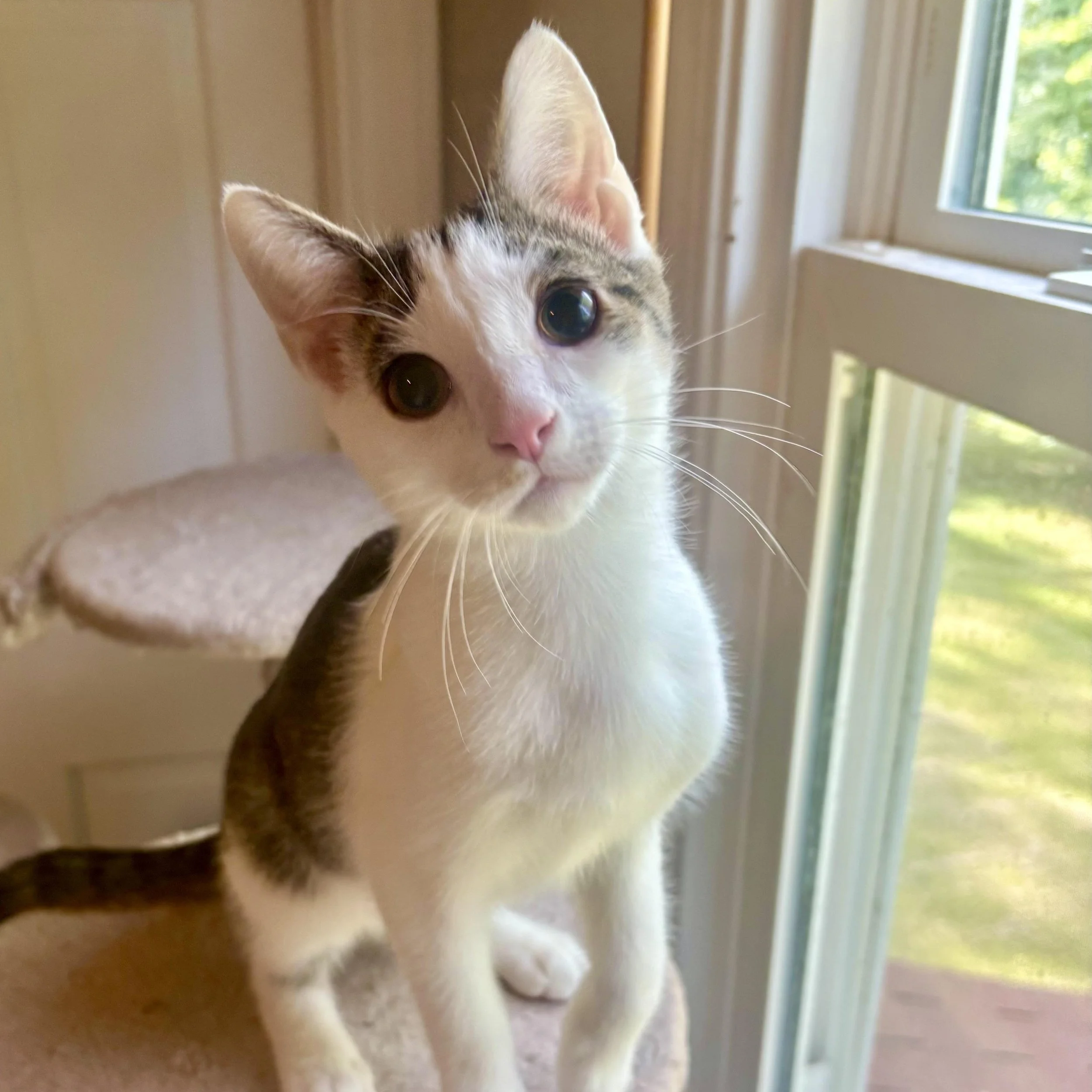 Hi, my name is Kosmo. I am a 5-month-old, male, tabby kitten with white. I am a sweet boy who is affectionate, loving, and playful. I am very confident and love EVERY person and cat that I meet! I haven’t been introduced to dogs or to small children yet. COMING SOON!