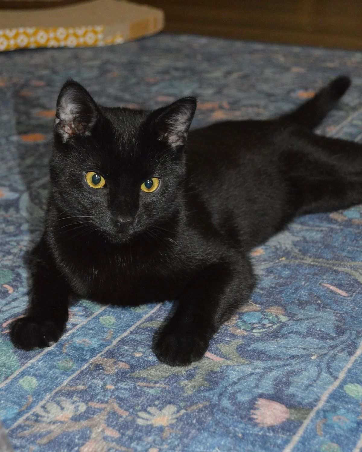 Hi, my name is Kuro. I am a 6-month-old, male, black kitten. Purring Hearts took me from another rescue to help me find my forever home! I’m sweet, playful, and full of energy. I love chasing toys, exploring new spots, and running around like a tiny panther. After I play, I’m happy to curl up next to you and purr. I’m gentle, curious, and I like being around my people. If you’re looking for a loving little shadow to follow you around and keep you company, I’m your guy! I’m good with other cats/kittens. I haven’t been introduced to dogs or to small children yet.