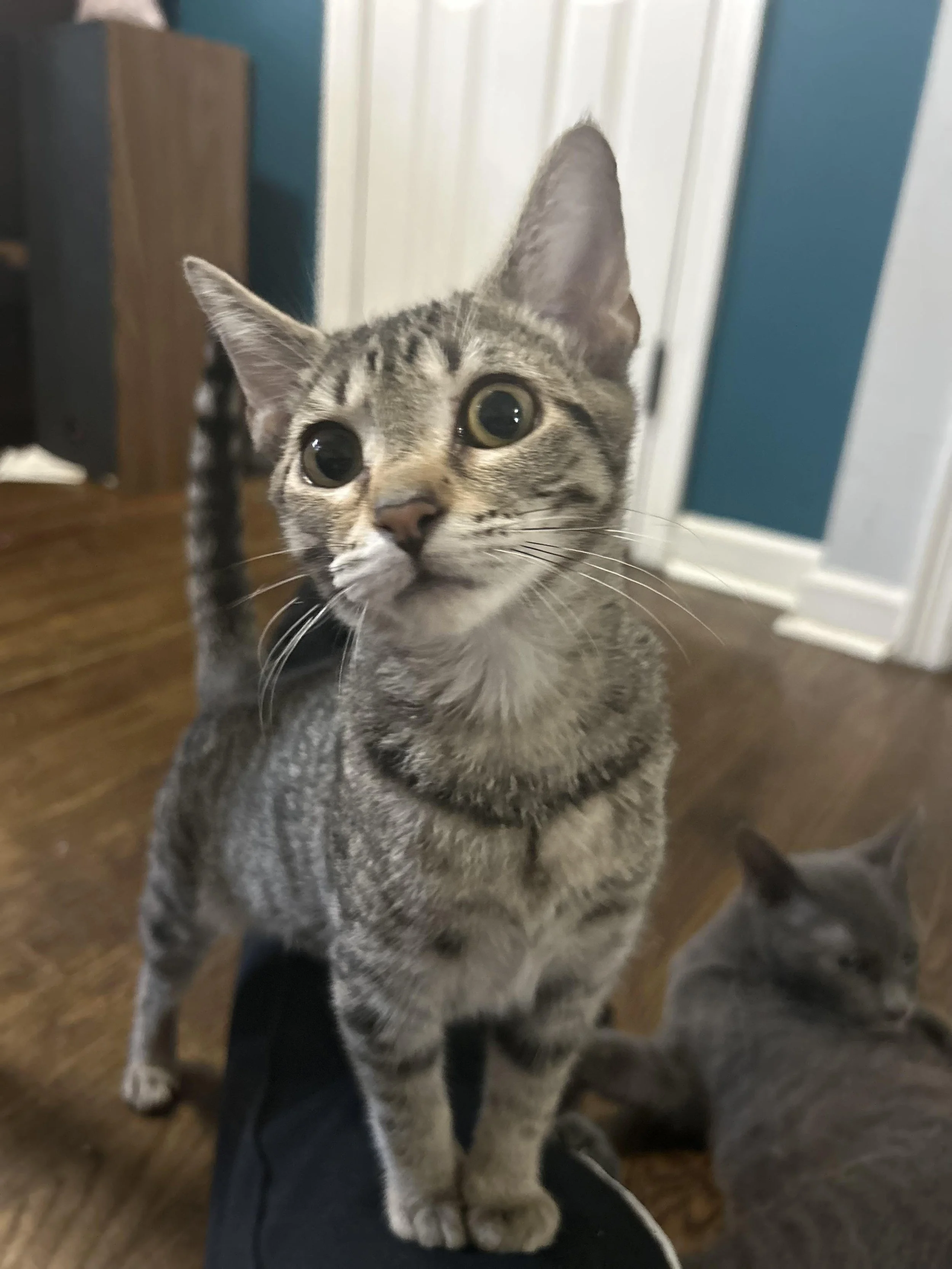 Hi, my name is Labubu. I am a 4-month-old, female, tabby kitten. I am a rambunctious and playful ball of energy who loves to chase any string, ball, or toy! I am curious about everything, but I’m also sweet and affectionate, purring for pets. If you are looking for a friendly, energetic cat, I would love to be your forever friend! I am good with other cats/kittens. I haven’t been introduced to dogs or to small children yet.