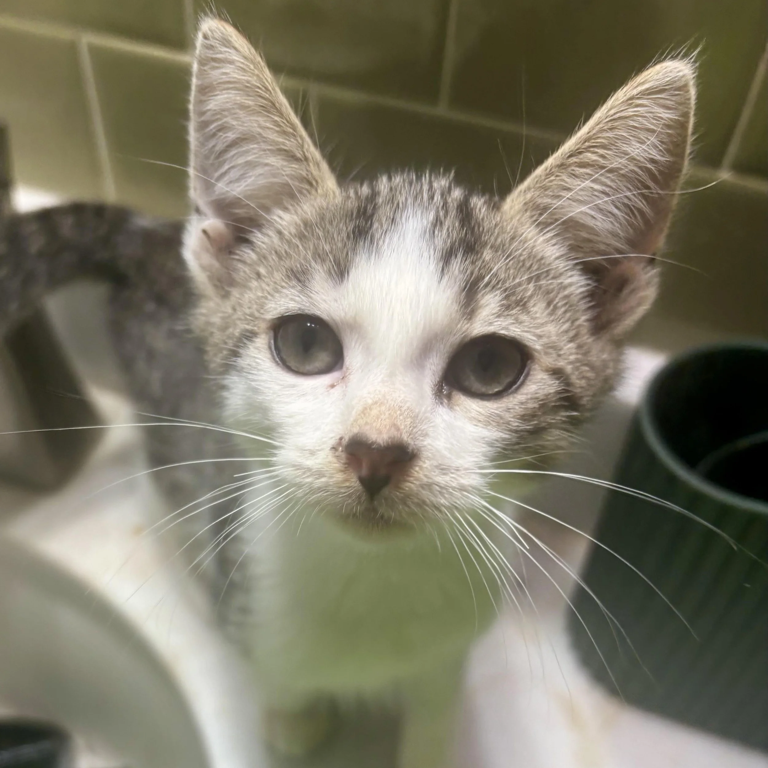 Hi, my name is Merlin. I am a 3-month-old, male, white and tabby kitten. I am playful, spunky, curious, and confident! I had a rough start to life – I was living outdoors and was very underweight when I was just a tiny baby. I have made major strides and LOVE attention, but can still be a little wary at times. I am super curious about everything. If there’s something new to explore, I’m the first one there! I have so much love to give – won’t you give me a forever home? I am great with other cats/kittens. I haven’t been introduced to dogs or to small children yet.