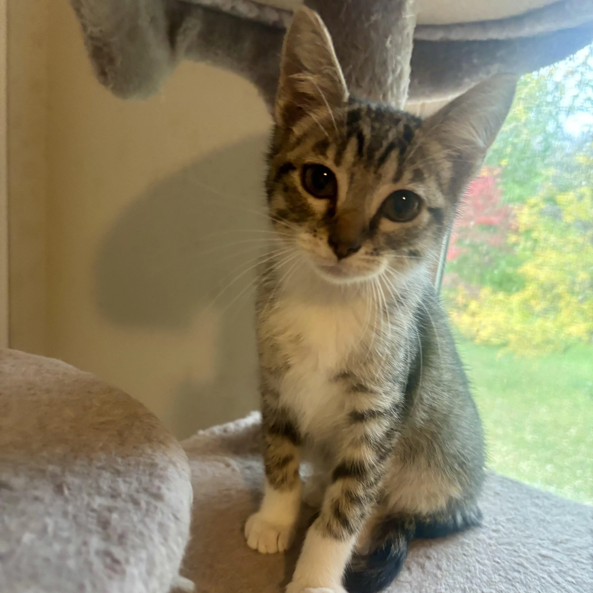 Hi, my name is Osprey. I am a 3-month-old, female, tabby and white kitten. My siblings and I had a rough start to life. We were born outside and had limited human contact for the first month of our lives. Because of this, I take some time to warm up to new people and environments. I love to chase toys, look out the window, and snuggle with my siblings. I am good with other cats/kittens. I haven’t been introduced to dogs or to small children yet. I would likely do best in a home with another young, confident cat to show me the ropes and with no dog and older (12+) or no children.