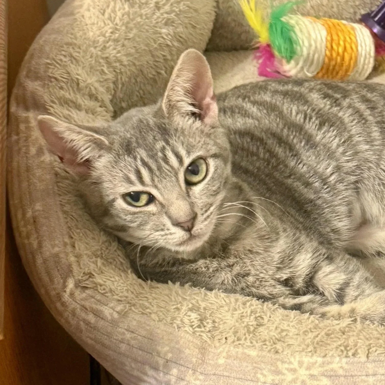 Hi, my name is Perch. I am a 6-month-old, female, tabby kitten. My foster siblings and I were all named after types of fish! My sister, Flounder, and I are a bit quieter than our siblings, but we are still loving and playful! We are practically identical and are both on the petite side. Flounder is my BFF, and we MUST be adopted together! I am good with cats/kittens. I haven’t been introduced to dogs or to small children yet.