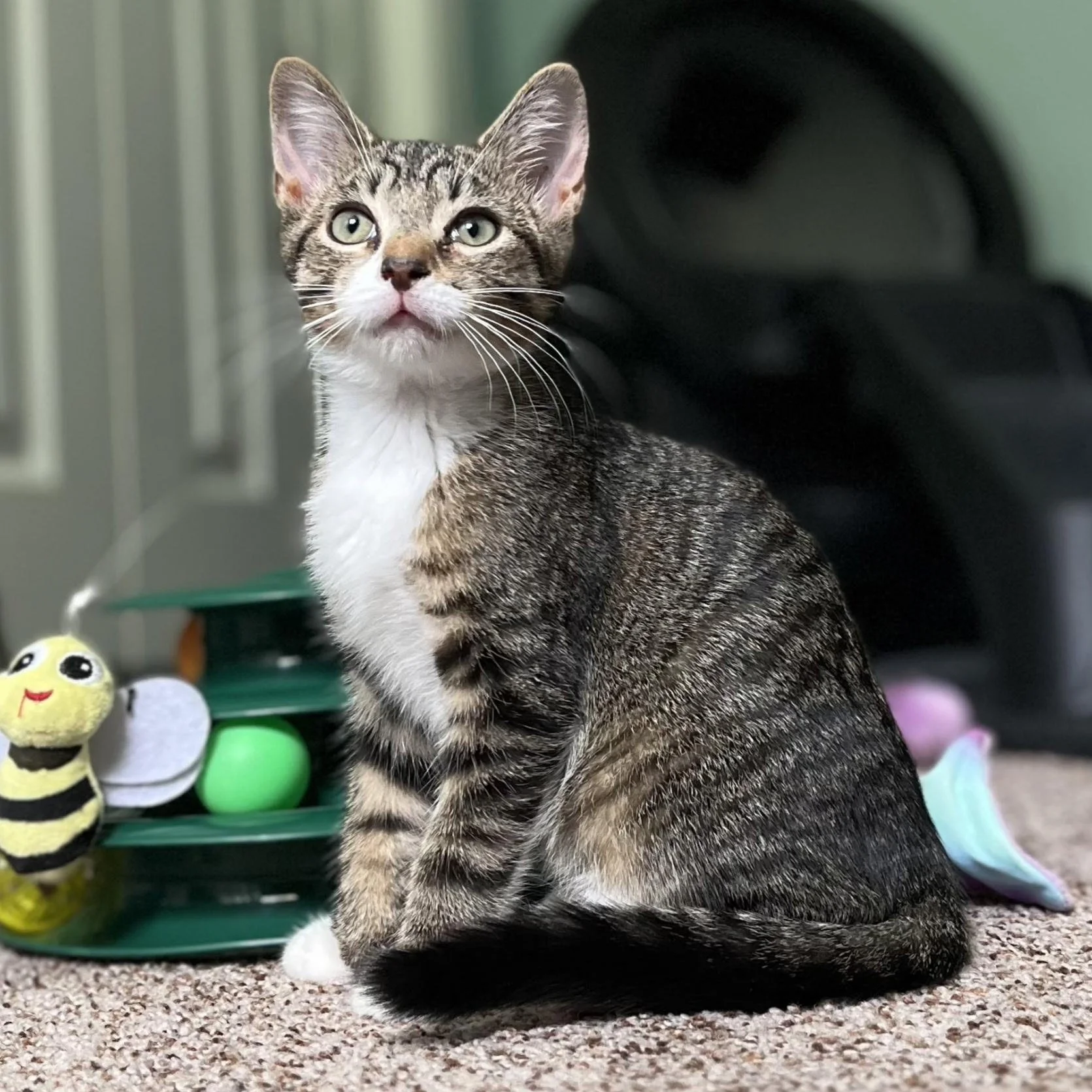 Hi, my name is Po Boy. I am a 4-month-old, male, tabby and white kitten. My siblings and I have southern food-themed names! I was rescued from the streets with my mom and two siblings, Grits and Okra. I am blossoming into such a sweet and charming kitten! I have striking white fur on my chest and paws, making me as handsome as I am lovable. Although I may be a bit shy at first, I quickly warm up and show my gentle nature. I love wand toys, cuddling, and often curl up to sleep with my foster mom at night. I am the perfect mix of playful and affectionate – a true sweetheart ready for my forever home! I am good with other cats/kittens. I haven’t been introduced to dogs or to small children yet.